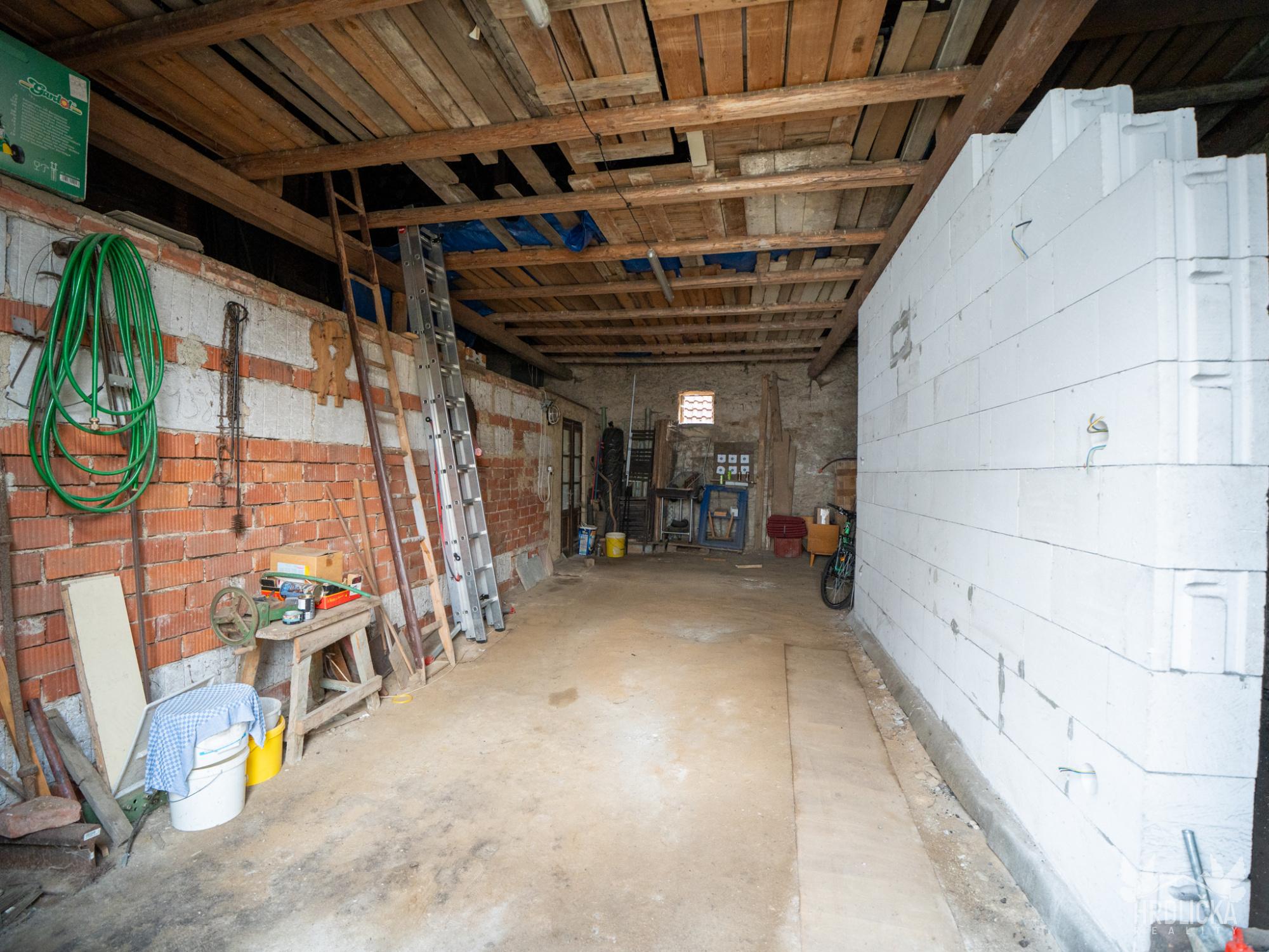 K domu náleží rozsáhlé zázemí – garáž, stodola, dílna a sklep, které poskytují dostatek prostoru pro uskladnění i dílenské práce.